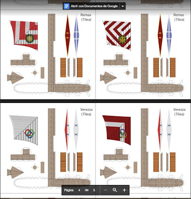It's been a while since I last posted anything here... well, anyway: a year ago I bought Evil Twin Artwork's Man O'War: Corsair videogame, and while not being the best videogame ever it made me feel curious again about the original game. I had seen Ralf Scheman's Man O' War papermodels and, after talking with him and finding out he wasn't making a galley model anytime soon, I decided to create my own, with a friend of mine (CH) adding textures and putting each Tilean and Estalian state's symbols in the flags and sails (the imperial patterns can be found elsewhere on the net). Here are the Tilean ones.
